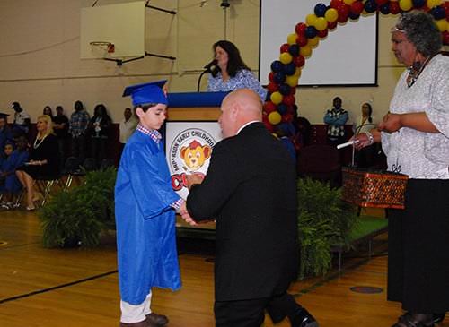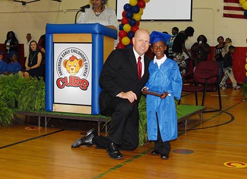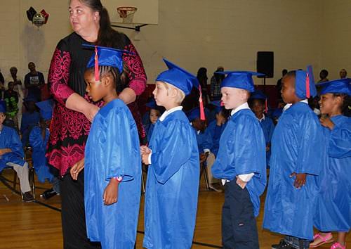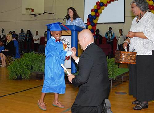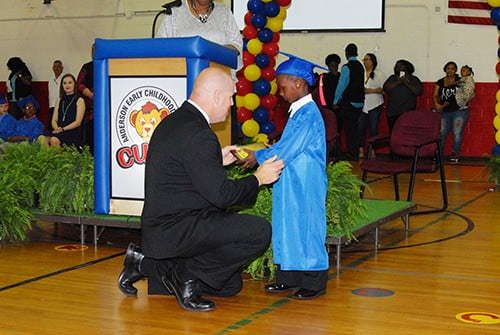 Anderson Early Childhood Center kindergarten students were honored at graduation ceremonies on Tuesday, May 17, in the school gymnasium. Friends and family members crowded the gym to see the smallest students wear their caps and gown and receive their graduation certificates. Assistant Principal Linda G. Sanders handed the certificates to Principal Charles Byrum as he positioned himself on the 206 students’ level to congratulate them with high fives and hugs. Two students, Mia Barrera and Jermarion Bufford, received recognition for having perfect attendance. The Reading Wall of Fame Top Readers recognized were Jacob Faulkner, Payton Littles, Robert Thornton, and Malena Washington. Mr. Byrum reported that students at Anderson had read a total of 40,000 books this year.
