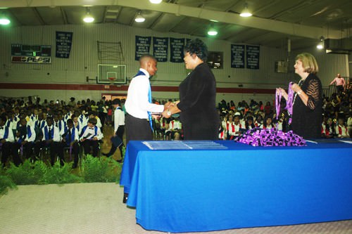 More than 200 eighth graders, the Class of 2018, gathered in the Haywood Middle School gymnasium on Tuesday, May 20, to participate in a promotion ceremony. Mr. and Miss HMS, Tristan Taylor and Temple Taylor, welcomed the crowd, and the HMS Glee Club sang “Share Your Good Will,” before the ceremony began. Recognizing the Top Ten was Guidance Counselor Michelle Brasfield. HMS Principal Yvette Blue introduced the speaker for the evening, HHS Principal Dr. Jerry Pyron. Presenting the students with their promotion certificates were Ms. Blue and Assistant Principal Jennifer Donald. Congratulating the students after they received their certificates was Superintendent of Schools Teresa Russell.