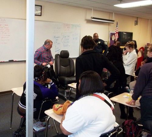The Child Development students in the Career and Tech Department at HHS recently received instructions about proper installation of child seats in vehicles. There were shown how to check vehicles for proper belts and how to see if the vehicle has a belt locking system. Officers also went over state laws regarding child seats. Students were shown with a baby demonstrator the consequences of improper installation and the type of injuries babies can receive. Students were able to practice and install different types of seats.