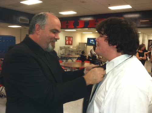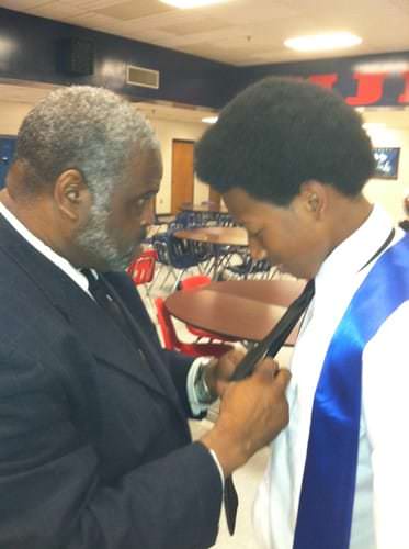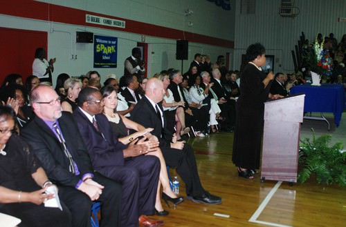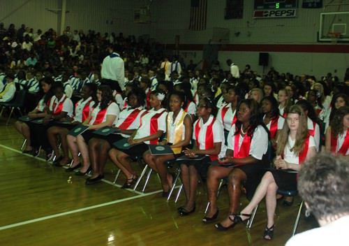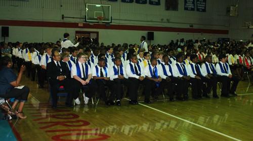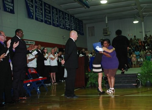 HMS hosted a promotion ceremony for the eighth grade students on Tuesday night, May 21. Despite the weather, the gym was packed with students, teachers, parents, local school board administrators, and county officials. The program began with a dedication of the 2013 promotion ceremony to Rashada Jordan, an eighth grader who passed away only a few weeks before graduation. Her certificate was presented to her grandmother. HHS Principal Dr. Jerry Pyron, the guest speaker, gave the students a glimpse of the expectations, fun, and challenges that they will face in the fall of 2013 when they enter Haywood High. During the ceremony, the Top Ten were recognized: (1) Elliot Garrett, (2) Felescia Sanders, (3) Brandon Taylor, (4) Mary Wyatt Pettigrew, (5) Laurel White, (6) William Chapman, (7) Taylor Ann King, (8) Telcia Nelson, (9) Allison Pilant, and (10) Adara Donald. After all the eighth graders had received their promotion certificates, everyone gave applause for the Class of 2017.