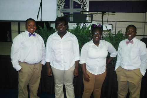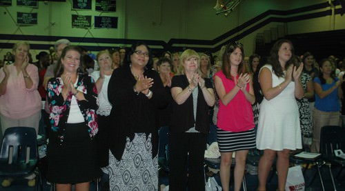 Mrs. Russell completed the program with a Charge to Teachers for the school year. Her message was that teachers make a tremendous difference in the lives of their students. Tyler Morton and three friends from HMS sang a rendition of “Happy” to close the school-wide session.