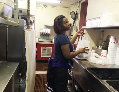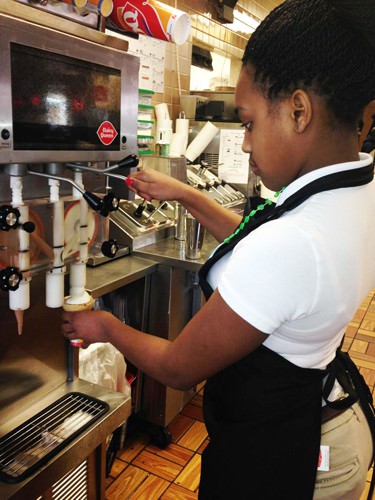 These students are job shadowing at the Dairy Queen: Camry Williams, Kierra Smith and Alison Wilson. In this picture, they are practicing making the upside down Blizzard.
